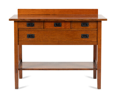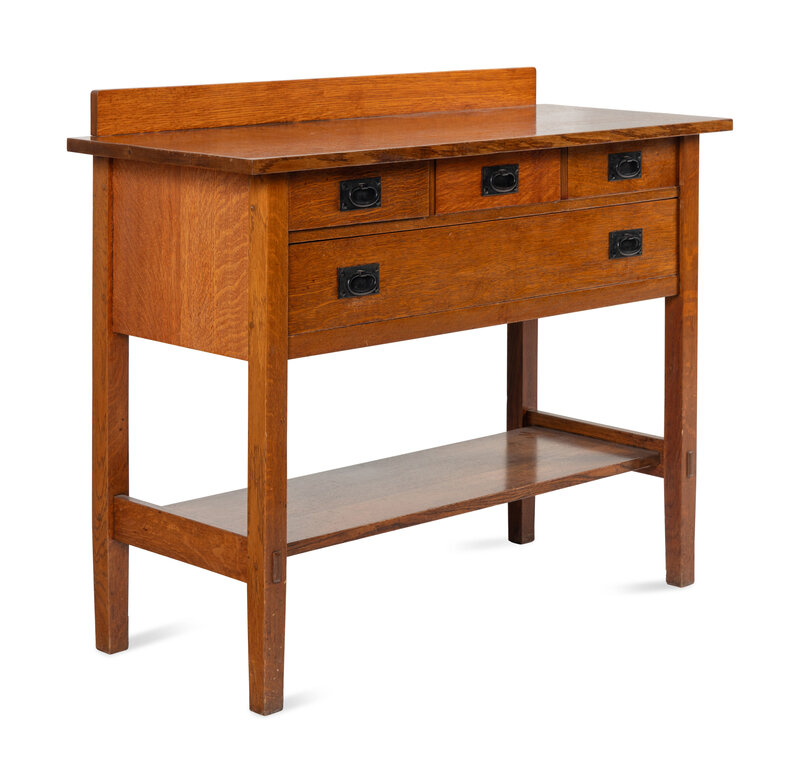 bearing a paper label on back that reads 'Made by Gustav Stickley in the Craftsman Workshops / Eastwood New York'