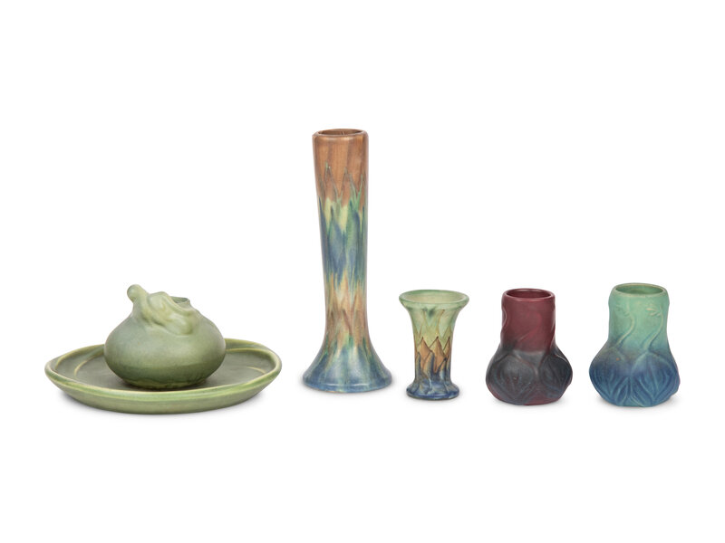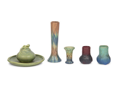 comprising a Rookwood inkwell with attached undertray, two Van Briggle vases, a marked Peters and Reed vase, and a small unsigned vase attributed to Peters and Reed; 5 items total.