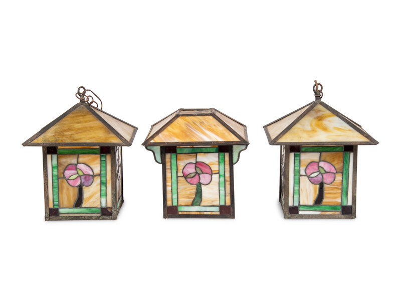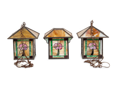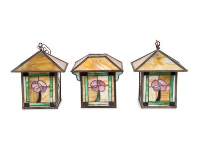 A Pair of Arts and Crafts Leaded Glass Pendant Lamps