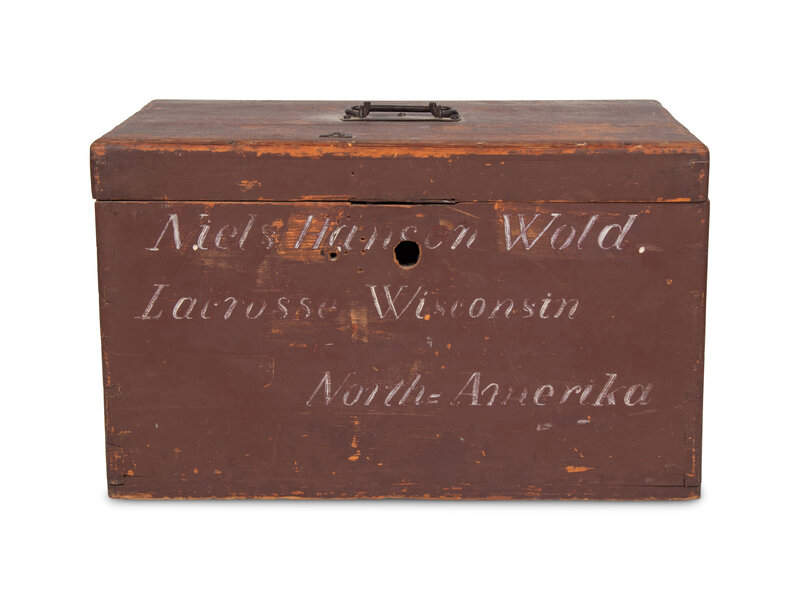 comprising four pairs of juggling pins, two pairs of hand weights, two lawn bowling balls, a pair of gym rings, a leather medicine ball, a discus, two tennis rackets, together with an associated small painted wood chest inscribed 'Niels Hansen Wold / Lacrosse Wisconsin / North Amerika.' 21 items total.