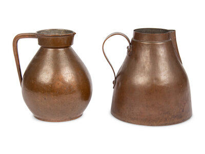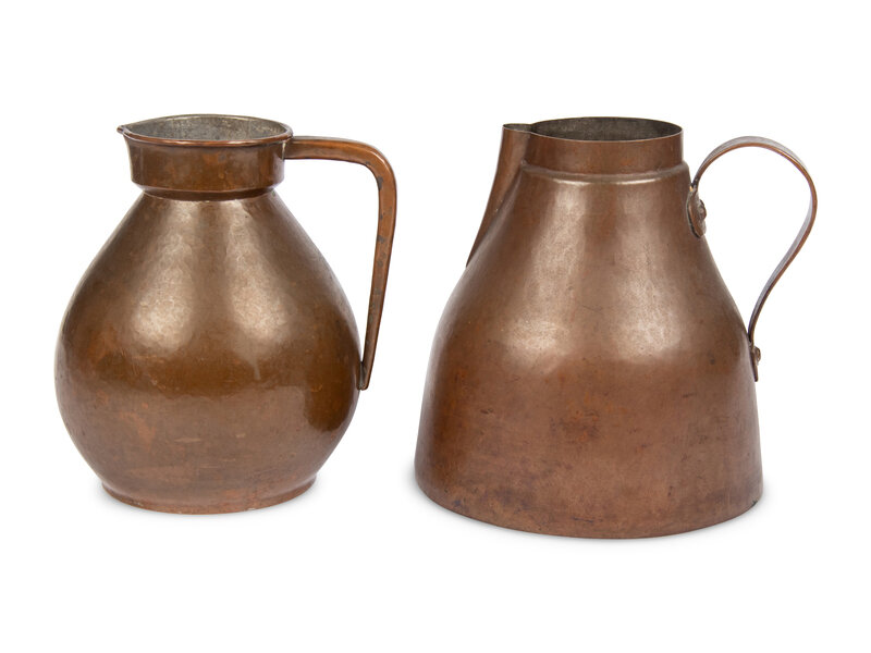 stamped 'Handwrought by F. Novick Chicago' and inscribed 'Class of 1923' on underside, together with another unmarked copper pitcher; 2 items total.