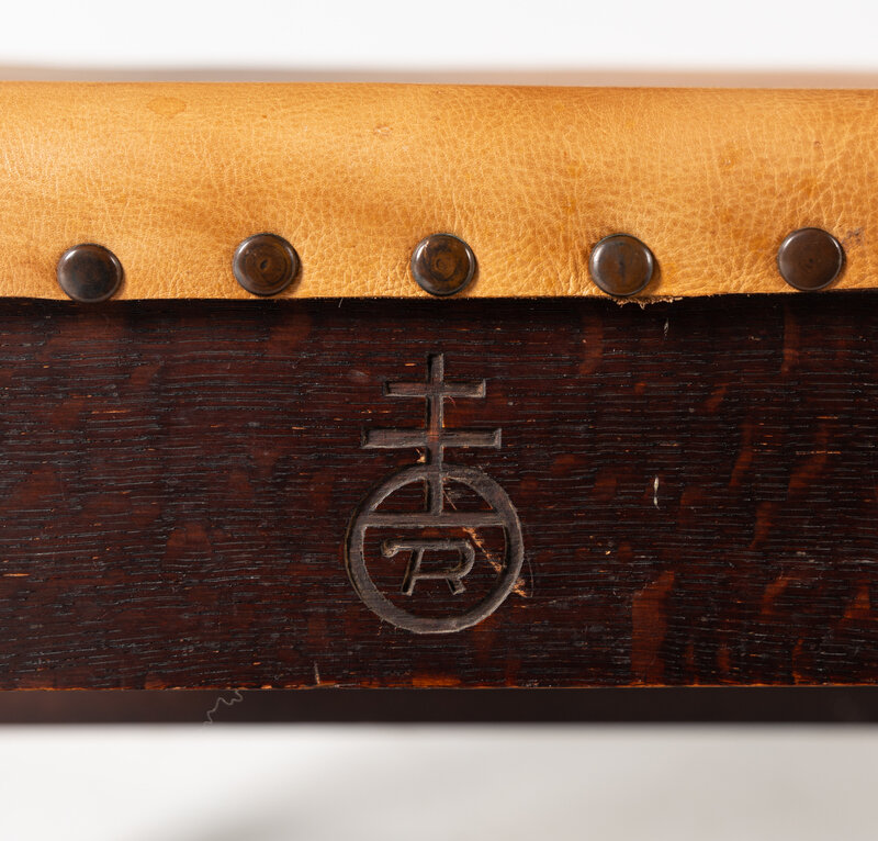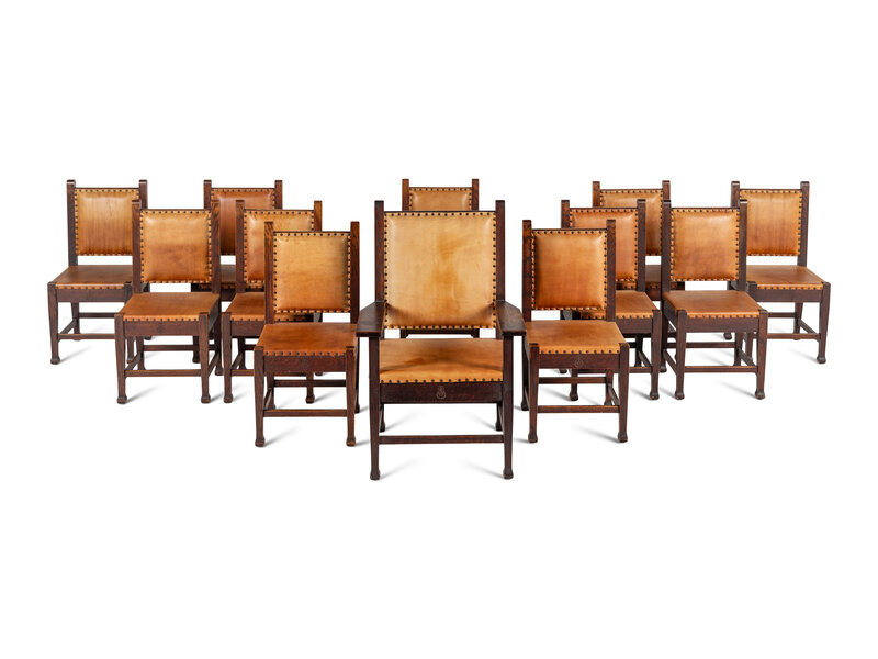 stamped Roycroft emblem on front of chair rail; comprising eleven side chairs and one arm chair.