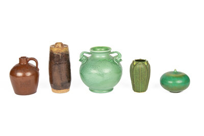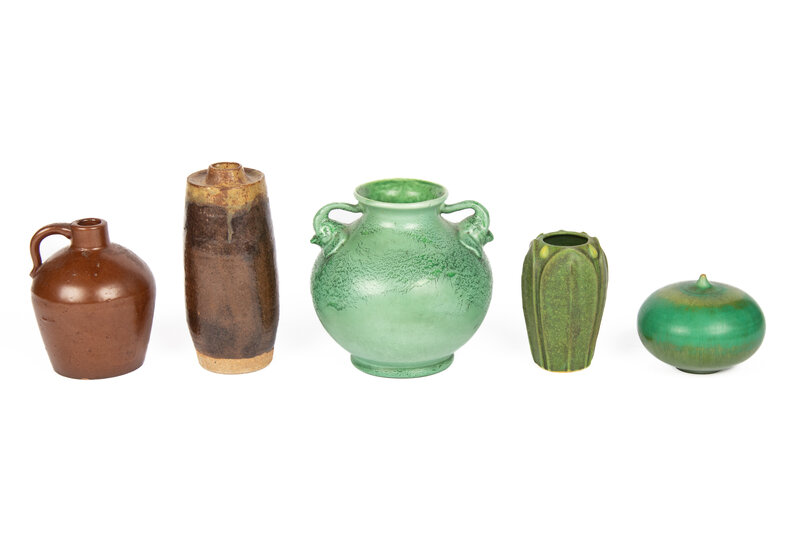 comprising a two handled vase by Red Wing, a syrup jug stamped 'The Roycroft Shops / East Aurora, NY' to underside, a brown glazed vase initialed illegibly to underside, a small green glazed vase by the Arts and Clay Company, and a small vessel by Phyllis Ihrman, signed on underside; 5 items total.