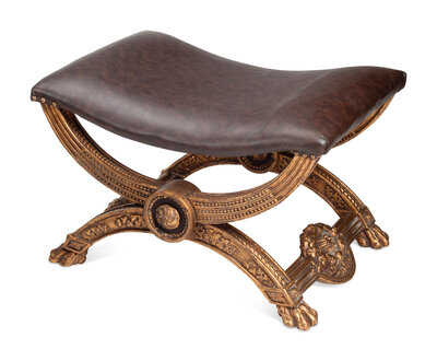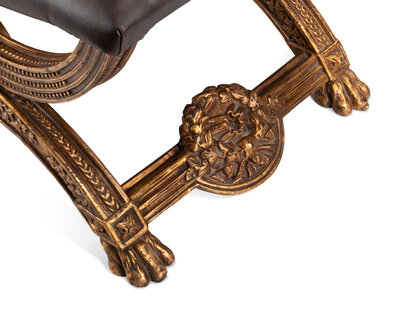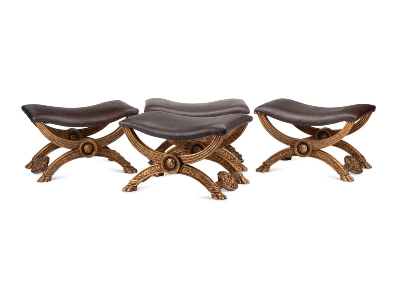 A Set of Four Italian Neoclassical Style Giltwood Benches with Leather Upholstery