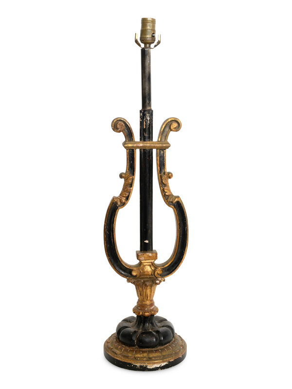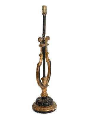 A Italian Ebonized Giltwood Harp-Form Lamp