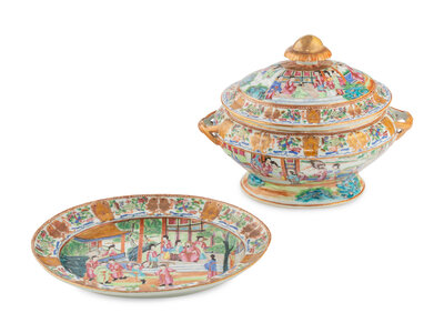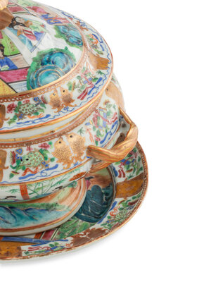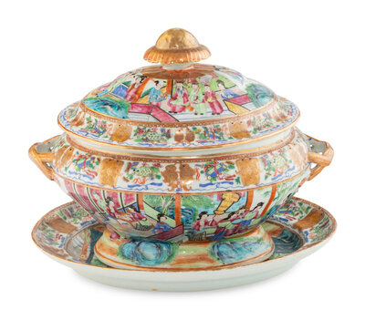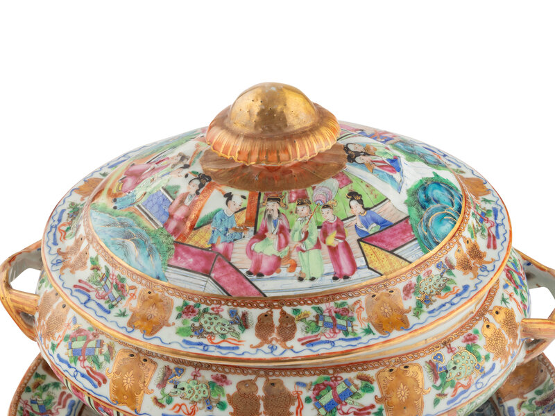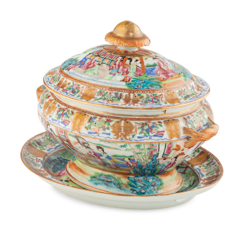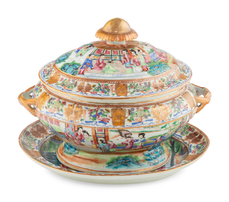 Height of tureen 11 x width over handles 15 x depth 10 inches; width of underplate 14 inches.