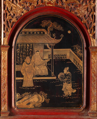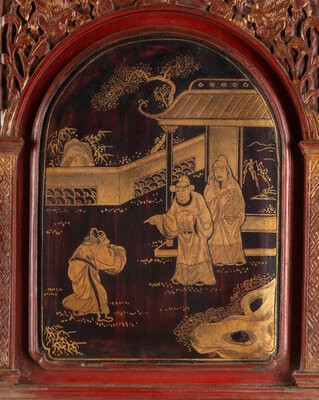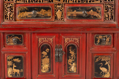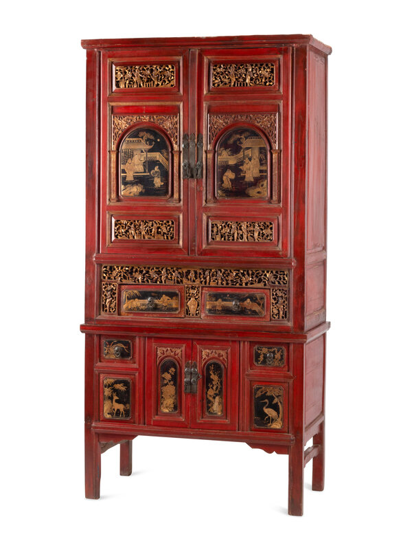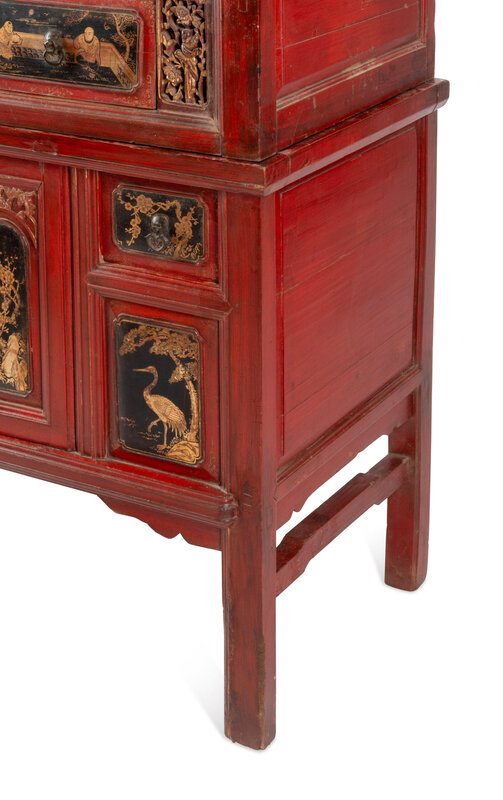 A Chinese Red Lacquer and Parcel Gilt Two-Part Cabinet