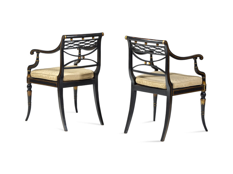 A Pair of Regency Ebonized and Parcel-Gilt Armchairs