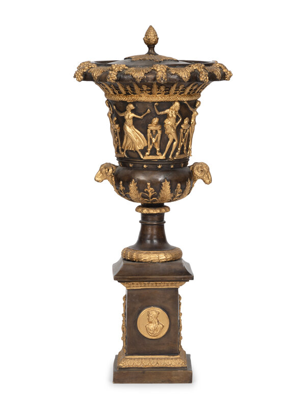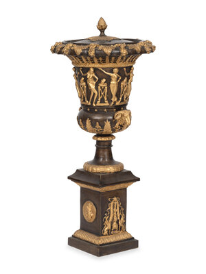 An Empire Style Cast Bronze Parcel Gilt Lidded Campagna Urn