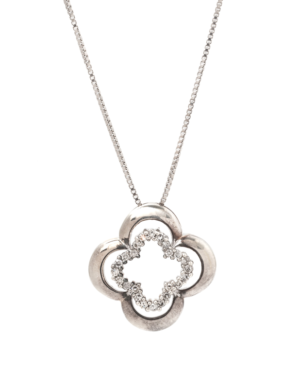 consisting of a double quatrefoil design containing 24 round single cut diamonds weighing approximately 0.28 carat total, suspended from a box link chain measuring approximately 1.00 mm wide. Pendant stamp: AV 925.Chain stamp: 925 PC.