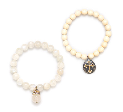 consisting of a bracelet containing 21 round moonstone beads measuring approximately 8.80 mm in diameter and a gilt silver and moonstone bead pendant containing 21 round brilliant cut diamonds weighing approximately 0.46 carat total strung on a stretchy cord, together with a bracelet containing 23 round off white hardstone beads measuring approximately 7.55 mm in diameter and a sterling silver and 18 karat yellow gold cross motif charm containing 13 round brilliant cut diamonds strung on a stretchy cord.Stamp: SS 18K.