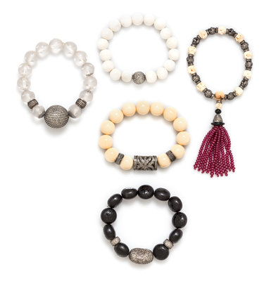 consisting of a bracelet containing one round silver bead set with diamonds and 17 round white hardstone beads, a bracelet containing one round silver bead and two rondelle beads set with diamonds and 13 round semi-polished rock crystal beads, a bracelet with silver skeleton and rondelle beads set with diamonds and carved white hardstone skeleton beads with tassel containing ten strands of ruby beads measuring approximately 3.50 mm wide, one bracelet containing a silver bean shape bead and two rondelle beads set with diamonds and 11 semi-polished onyx beads, together with one bracelet containing an open work barrel bead and two rondelle beads set with diamonds and 13 round plastic beads, all strung on a stretchy cord.