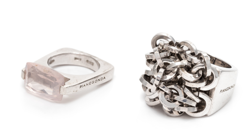 consisting of a ring containing a cushion shape rose quartz measuring approximately 11.05 x 15.95 mm together with a ring mounted with a cascade of round link chain.Stamp: PIANEGONDA ITALY (Italian hallmark) 925.