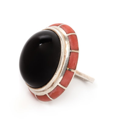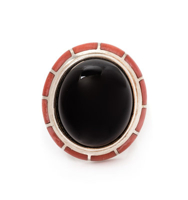 A Sterling Silver, Onyx and Coral 'Soleil Noir' Ring, Erte, 12.75 dwts.