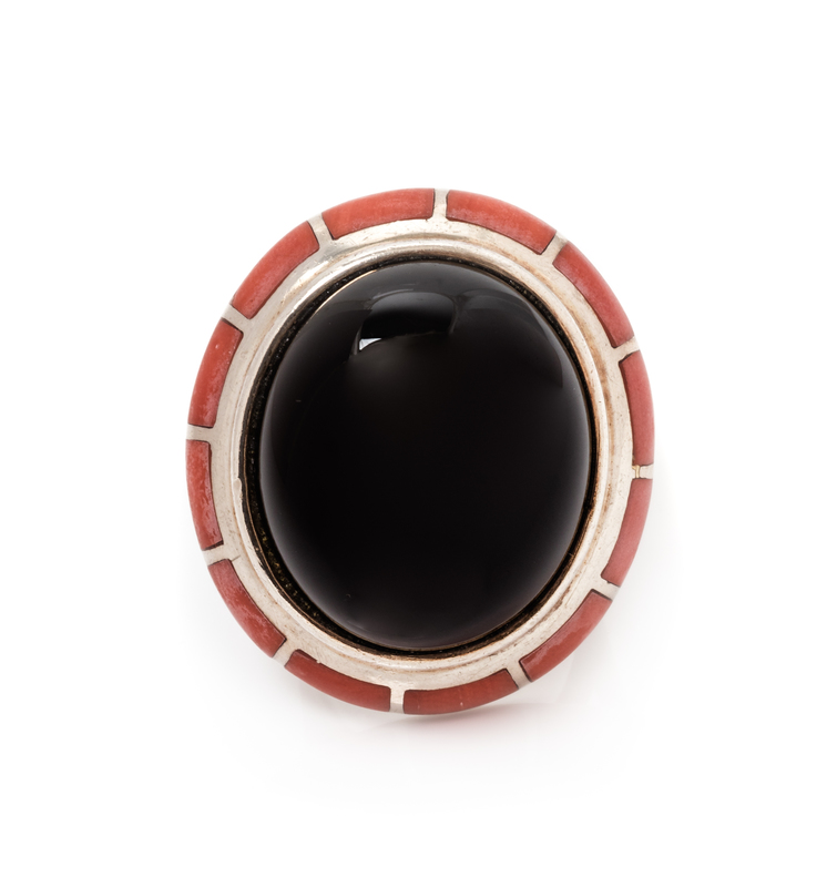 containing one oval cabochon cut onyx measuring approximately 24.35 x 20.69 x 12.35 mm accented by with 12 inlaid coral.Stamp: (Erte maker's mark) 156/250 CFA STERLING.