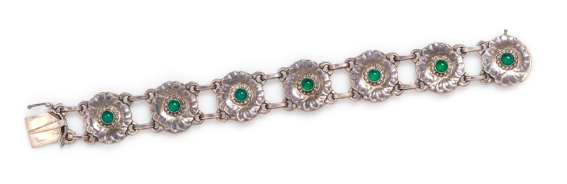consisting of seven flower links the centers surmounted with seven round cabochon cut dyed green onyx measuring approximately 4.60 mm in diameter.Stamp: 925 (maker's mark for Georg Jensen) STERLING DENMARK 36.
