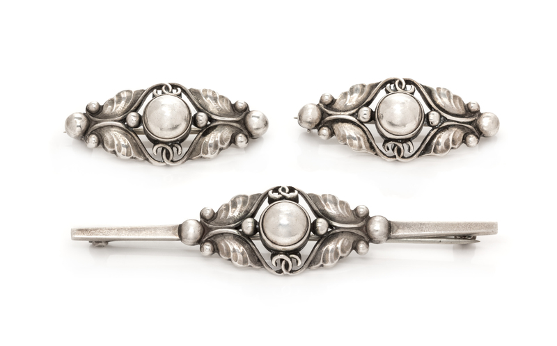 consisting of a bar brooch with silver bead designs measuring approximately 62.00 mm long together with a pair of matching brooches measuring approximately 31.00 mm long.Stamp: (Georg Jensen maker's mark) STERLING DENMARK 224B.Stamp: (Georg Jensen maker's mark) STERLING DENMARK 224A.