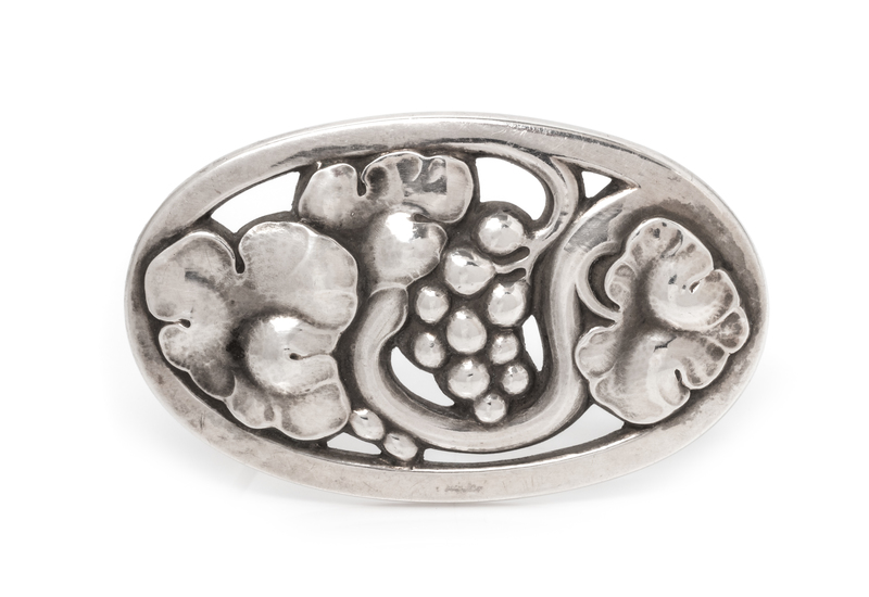 consisting of a stylized grapevine design in an oval surround.Stamp: (maker's mark for Georg Jensen) STERLING DENMARK 177 B (British hallmarks).