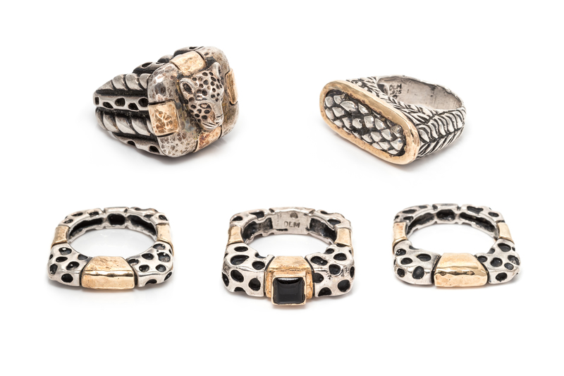 consisting of a pair of square form stacking rings with organic design elements and applied hammered 14 karat yellow gold, a square form ring containing one square cabochon cut onyx measuring approximately 5.60 x 5.60 mm, a ring with organic design elements and applied hammered 14 karat yellow gold, one leaf motif sterling silver ring with oval shape 14 karat yellow gold surround together with a sterling silver ring with jaguar head.Stamp: DLM 925 14K.