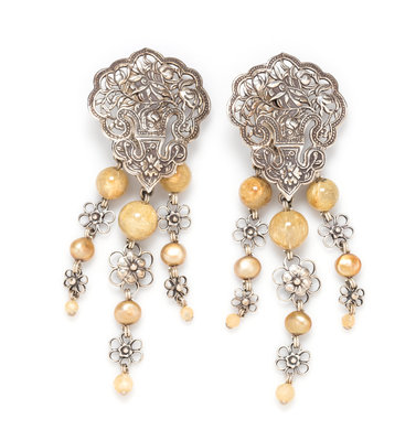 consisting of openwork foliate design, suspending a floral motif link fringe containing six round rutilated quartz beads measuring approximately 10.30-12.25 mm in diameter, six pearls measuring approximately 8.05-8.55 mm in diameter and six faceted quartz beads measuring approximately 4.45-6.05 mm in diameter.Stamp: STEPHEN DWECK STERLING 925.