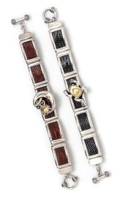 consisting of one 'Goodnight Moon Owl' bracelet containing an owl with yellow gold front and two round mixed cut ruby eyes measuring approximately 1.00 mm in diameter sitting on a crescent moon containing three round mixed cut sapphires measuring approximately 1.80 mm, links strung on a brown leather strap with toggle clasp, together with an 'Otis Frog' bracelet containing a silver and yellow gold frog and silver links strung on a black leather strap with toggle clasp.Stamp: SAINT 925.