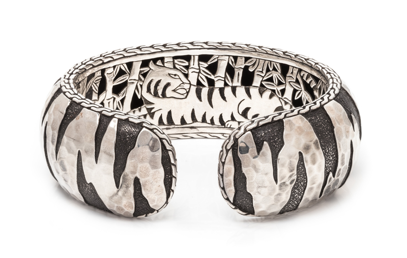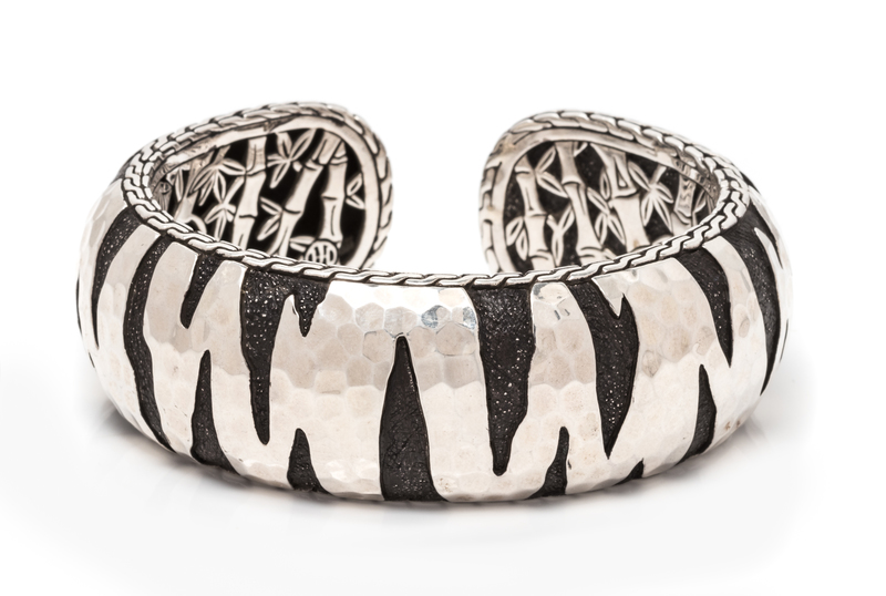 consisting of a carved tiger stripe motif in oxidized silver and a hammered finish, with a side hinge.Stamp: 925 (maker's mark for John Hardy).