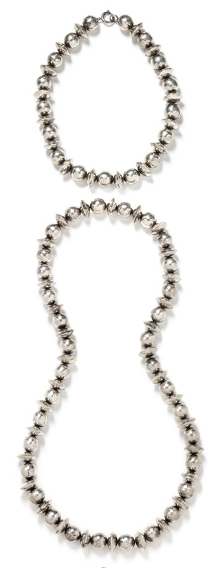 consisting of two necklaces of alternating sphere and disc shape beads, one necklace strung in an endless style, the other with a spring ring clasp.Stamp: STERLING.