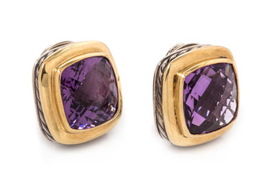 A Pair of Sterling Silver, 18 Karat Yellow Gold and Amethyst 'Albion' Earclips, David Yurman, 14.90 dwts.