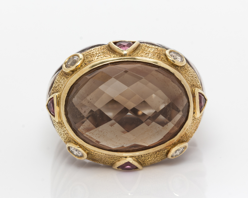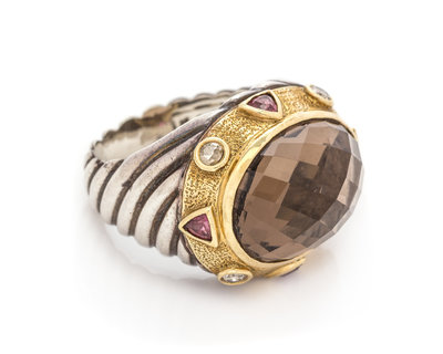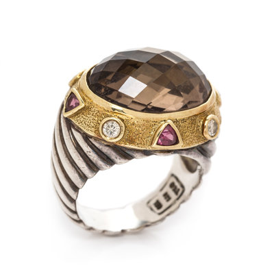 A Sterling Silver, 18 Karat Yellow Gold, Smoky Quartz, Diamond and Pink Tourmaline Ring, David Yurman, 9.50 dwts.