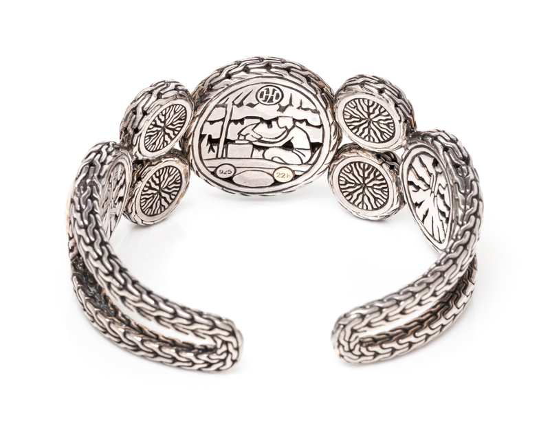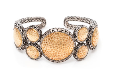 consisting of a textured sterling silver hinged cuff with seven applied round hammered 22 karat gold discs.Stamp: (maker's mark for John Hardy) 925 22K.