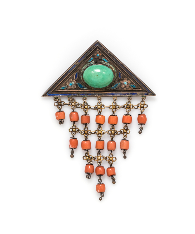 consisting of a silver triangular brooch containing one oval shape cabochon cut turquoise measuring approximately 11.80 x 14.55 mm and surrounding polychrome enamel detail suspending openwork link and coral bead fringe.Stamp: SILVER.