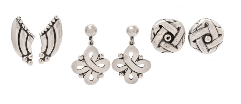 consisting of a pair of square knot motif screwback earclips by William Spratling, a pair of dangle screwback earclips by Los Castillos, together with a pair of screwback earclips by Hector Aguilar.Stamp: SPRATLING MADE IN MEXICO.Stamp: TAXCO LOS CASTILLO.Stamp: .940 (Hector Aguilar marker's mark) TAXCO MEXCO.