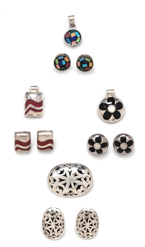 consisting of an oval shape shadow cut pendant/brooch and matching pair of earrings, consisting of an onyx and white hardstone flower motif pendant and matching pair of earrings, rectangular shape pendant with two curved stripes of red enamel and a matching pair of earrings, together with a round pendant containing multigem hardstone inlay, together with a matching pair of earrings.Stamp: TR-143 MEXICO (obscured) 925.Stamp: TC-528 MEXICO 925.Stamp: TC-328 MEXICO 925.Stamp: OMA TM-212 MEXICO925.