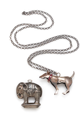 consisting of a three dimensional dog pendant with red and black enameled collar suspending a carnelian bead, attached to a silver rolo chain necklace, together with an elephant motif rattle pendant.Stamp: (C.M. maker's mark) (British hallmarks).Stamp: STERLING (maker's mark for Webster Manufacturing Co.)