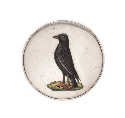 consisting of a circular disc measuring approximately 35.50 mm in diameter with inlaid painted polychrome enamel depicting a standing bird.Stamp: SILVER.
