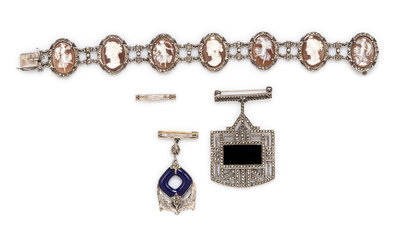 consisting of a 14 karat yellow gold bar brooch suspending a silver filigree pendant with central blue enamel cushion design and accented with numerous round hematite stones, a 14 karat yellow gold bar brooch, a silver bracelet containing seven oval cameos carved with Classical female scenes plaques measuring approximately 18.00 x 13.00 mm and numerous round hematite stones, together with a silver brooch suspending a Art Deco style pendant with central black glass rectangular plaque and numerous round hematite stones.Stamp: (Richardson Manufacturing Co. maker's mark) 14K.