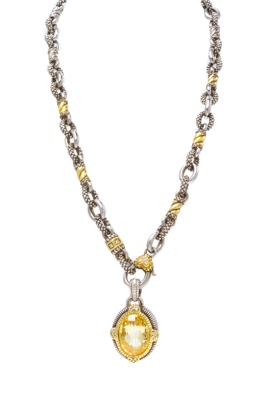 A Sterling Silver, 18 Karat Yellow Gold, Canary Quartz and Diamond 'Two' Pendant/Necklace, Judith Ripka, 45.50 dwts.