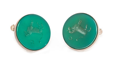 A Pair of Sterling Silver and Dyed Green Chalcedony 'Taurus' Intaglio Cufflinks, 8.80 dwts.