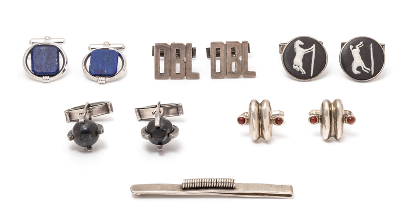 consisting of a sterling silver tie bar surmounted with coiled spring, a pair of cufflinks with four round cabochon cut carnelian measuring approximately 2.60 mm in diameter, a pair of sterling silver 'DBL' monogrammed cufflinks, a pair of sterling silver cufflinks with black jasper Wedgwood jumping horse motif plaques, a pair of cufflinks containing two lapis lazuli plaques, together with a pair of sterling silver cufflinks containing two metal spheres.Stamp: STERLING 516 DENMARK.Stamp: STERLING HANDMADE.Stamp: STERLING SILVER FAW (British hallmarks)Stamp: DESTINO STERLING.Stamp: 925.
