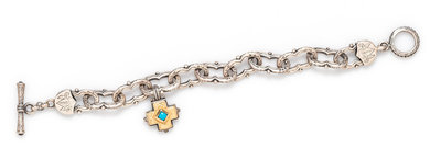 consisting of an engraved fancy link sterling silver bracelet with toggle clasp containing two round cabochon cut garnets and suspending a cross shaped charm containing one cushion shape cabochon turquoise with 18 karat yellow gold engraved surround.Stamp: KONSTANTINO 750 925 R. 78.