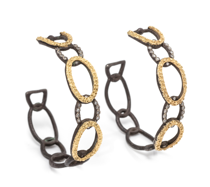 consisting of sterling silver ovals surmounted with textured 18 karat yellow gold accents containing 40 round brilliant cut diamonds weighing approximately 0.17 carat total.Stamp: 18KT 925 ARMENTA.