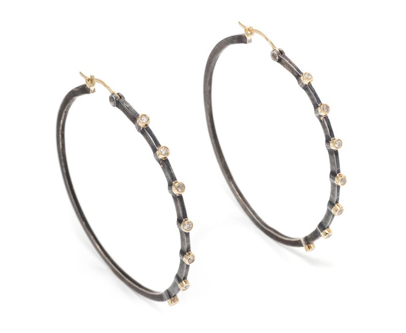A Pair of Oxidized Silver, 18 Karat Yellow Gold and Diamond Hoop Earrings, 5.60 dwts.