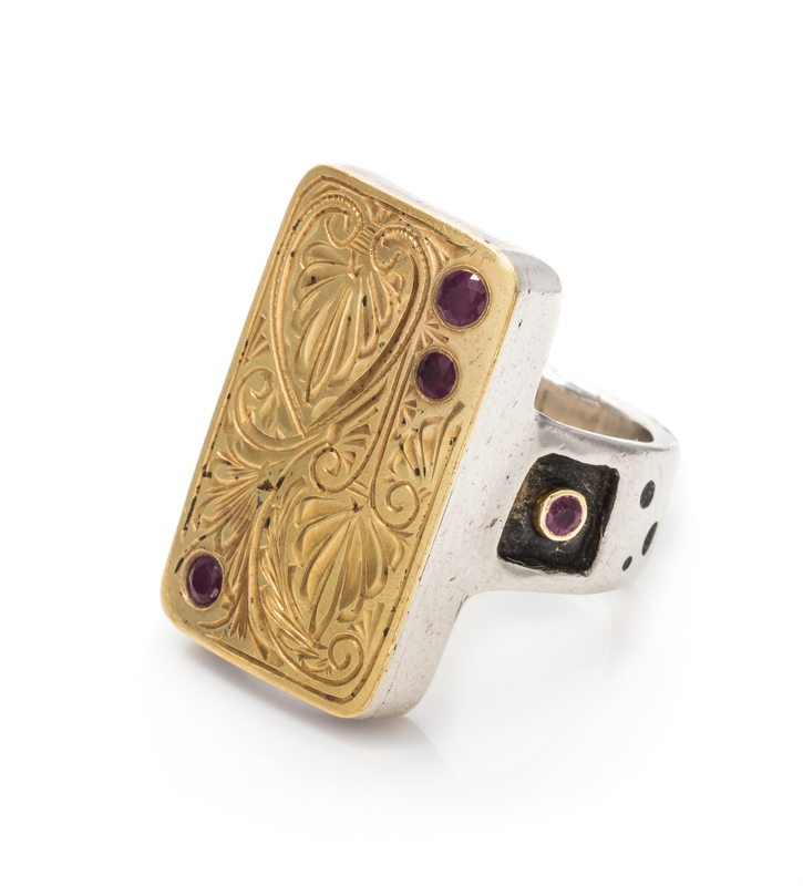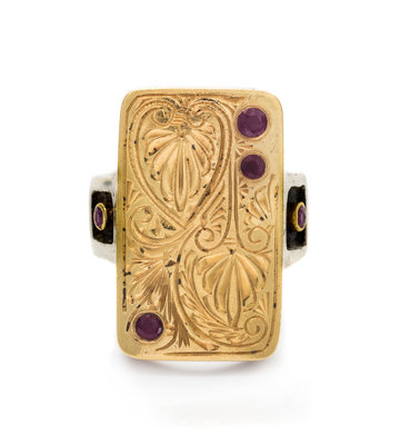 consisting of an 18 karat yellow gold rectangular plaque with engraved Arabesque design and containing three round mixed cut rubies measuring approximately 2.20-3.00 mm in diameter, the sterling silver shank containing two round mixed cut rubies measuring approximately 2.10 mm in diameter.Stamp: K OX 82 750 925.