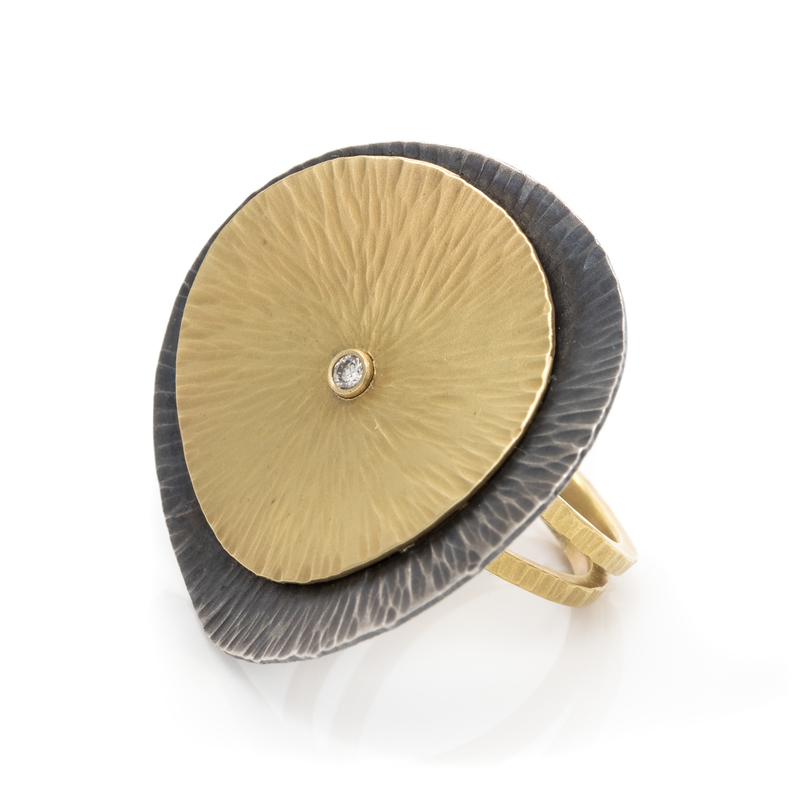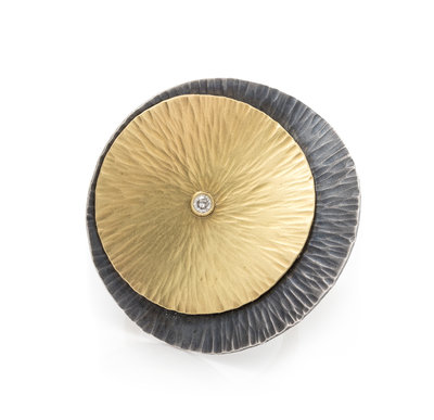consisting of silver and yellow gold textured layered discs centered with one round brilliant cut diamond weighing approximately 0.02 carat.Stamp: 18K.