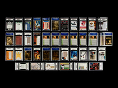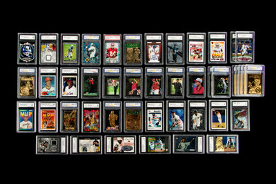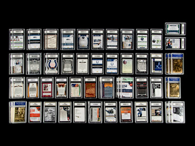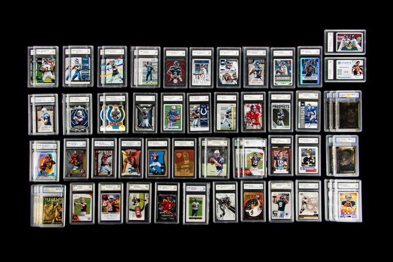 Football: 1996 Collectors Edge Advantage #17 Keyshawn Johnson Rookie; 1997 Bleachers 23KT Gold Joe Namath Broadway Joe (x5); 1998 Collectors Edge Peyton Manning #135 1st Place Rookie (x2); 2000 Edge Masters Retail #230 Sylvester Morris Rookie (PSA10 GEM-MT10); 2001 Dynagon Drew Brees #3 Top of the Class Rookie; 2001 Fleer Platinum Terry Bradshaw #GP19 Greatest Plays; 2001 Topps Reggie Wayne #344 Rookie; 2001 Upper Deck Victory Drew Brees #415 Rookie; 2002 SCI Eli Manning #9 Gold Foil Rookie; 2003 Merrick Mint Laser Line Eli Manning Rookie (x3); 2004 Merrick Mint Laser Line Gold Ben Roethlisberger Rookie (x2); 2004 OMR Ben Roethlisberger #NNO Rookie; 2004 Topps Chrome Eli Manning #PP5 Premiere Prospects Rookie; 2004 Upper Deck Eli Manning #1 Rookie Premiere; 2005 Premier Prospects Reggie Bush Rookie Art Card; 2005 Sage Roddy White 37/40 Bronze Autograph Rookie; 2005 Topps Darren Sproles #404 Rookie; 2006 Merrick Mint Peyton Manning #NNO Feel the Game Gold Card; 2006 Topps Reggie Bush #NFL5 NFL8306 Rookie; 2007 Premier Prospects Colt McCoy Art Card Rookie 1 of 499; 2010 Rookies & Stars Darren Sproles #121; 2010 Rookies & Stars Riley Cooper 135/249 Longevity Rookie; 2010 Score Colt Mccoy #323 Rookie; 2010 Score Tim Tebow #396 Rookie (x3); 2010 Topps Drew Brees #RH44- DB Ring of Honor; 2010 Topps Gale Sayers #75DA-18 75th Draft; 2010 Topps Peyton Manning #360 Rookie Reprint; 2010 Topps Tim Tebow #75DA-12 75th Draft Rookie; 2011 Score Colin Kaepernick #320 SP Variation Rookie; 2011 Topps RR Jordy Nelson #JN Playmaker Jersey; 2011 Topps RR Micahel Bush #MB Draft Selections Game Jersey; 2012 Finest Andrew Luck #AL Lucky Cuts Refractor Die-Cut Rookie (x2); 2012 Finest Robert Griffin III #120 Rookie; 2012 Panini Robert Griffin III 52/499 National Rookie; 2012 Prestige Andrew Luck #229 Rookie; 2012 Prestige Russell Wilson #238 Extra Points Rookie; 2012 Prestige Russell Wilson #238 Rookie; 2012 Prestige Russell Wilson #31 Draft Tickets Rookie; 2012 Score Andrew Luck #1 Hot Rookies (x2); 2012 Score Andrew Luck #304 Rookie; 2012 Score Glossy Russell Wilson #22 Hot Rookies; 2012 Score Russell Wilson #372 Rookie (x2); 2012 Strata Andrew Luck #150 Rookie; 2012 Strata Andrew Luck #AL Die-Cut Rookie (x2); 2012 Strata Dwayne Allen #DA Die-Cut Rookie; 2012 Topps Magic Andrew Luck #1 Rookie; 2012 Topps Platinum Robert Griffin III #120 Orange Refractor Rookie; 2012 Topps Platinum Robert Griffin III #120 Rookie Refractor; 2012 Topps Platinum Robert Griffin III #RG Platinum Die-Cut Refractor Rookie; 2013 Absolute Football Russell Wilson #86; 2013 Panini Contenders Russell Wilson #10 MVP Contenders; 2013 Rookies & Stars Russell Wilson #86 (x2); 2013 Score Russell Wilson #327 Future Franchise; 2013 Topps Magic Russell Wilson #RW Aerial Attack (x2); 2013 Topps Seattle Seahawks #84 NFL West Division; 2013 Totally Certified Russell Wilson #44 Totally Red; 2014 Prestige Derek Carr #10 Road to the NFL Rookie; 2014 Score Carlos Hyde #HR13-Hot Rookie; 2014 Score Derek Carr #HR10 Hot Rookie (x2); 2014 Score Russell Wilson #249 Hot 100 Foil; 2014 Upper Deck Johnny Manziel #80 Rookie (x2).