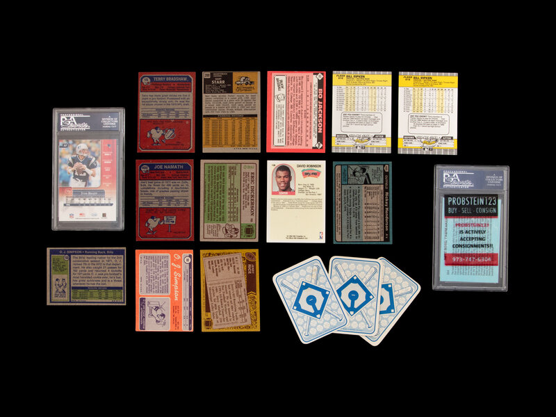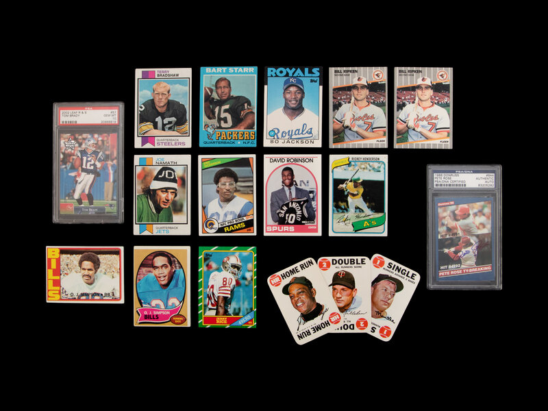 Football: 1970 Topps O.J. Simpson No. 90; 1971 Topps Bart Starr No. 200; 1972 Topps O.J. Simpson No. 160; 1973 Topps Joe Namath No. 400; 1973 Topps Terry Bradshaw No. 15; 1984 Topps Eric Dickerson No. 280; 1986 Topps Jerry Rice No. 161; 2002 Leaf R & S Tom Brady (PSA 10-GEM MT).
