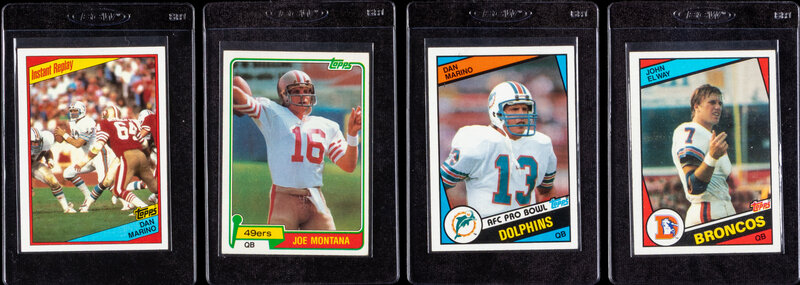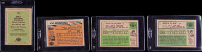 1981 Topps Joe Montana; 1983 Topps John Elway; 1983 Topps Dan Marino; 1983 Topps Dan Marino Instant Replay.