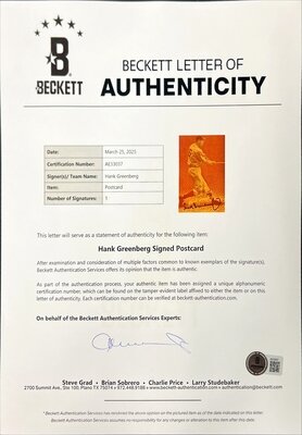 A Hank Greenberg Signed Autograph Exhibit Reprint Card (Beckett Authentication Services)