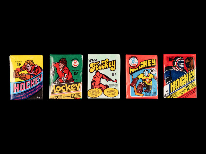 comprising 1974 O-Pee-Chee WHA Hockey Wax Pack; 1976 O-Pee-Chee WHA Hockey Wax Pack; 1977 O-Pee-Chee WHA Hockey Wax Pack; 1977 O-Pee-Chee Hockey Wax Pack; 1978 O-Pee-Chee Hockey Wax Pack.
