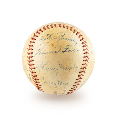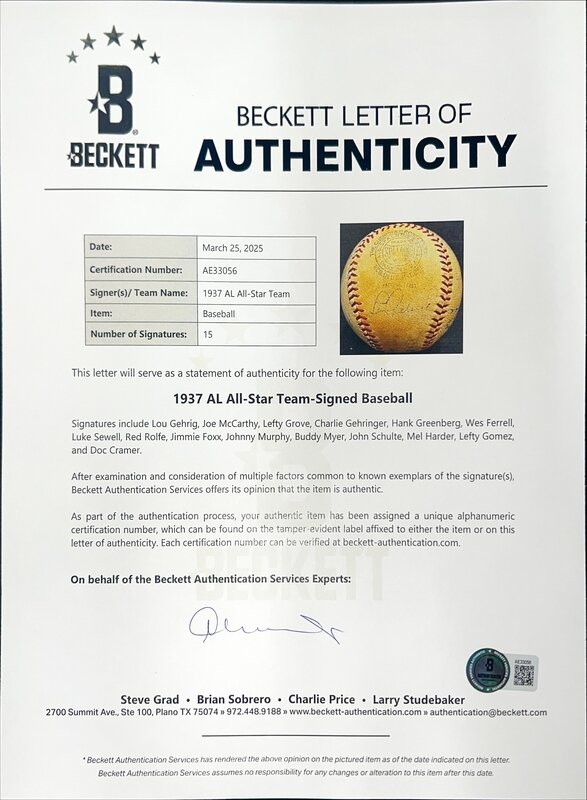 A 1937 American League All Star Team Signed Autograph Baseball Including Lou Gehrig, Hank Greenberg and Jimmie Foxx (Beckett Authentication Services)